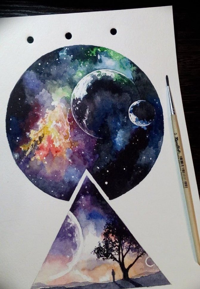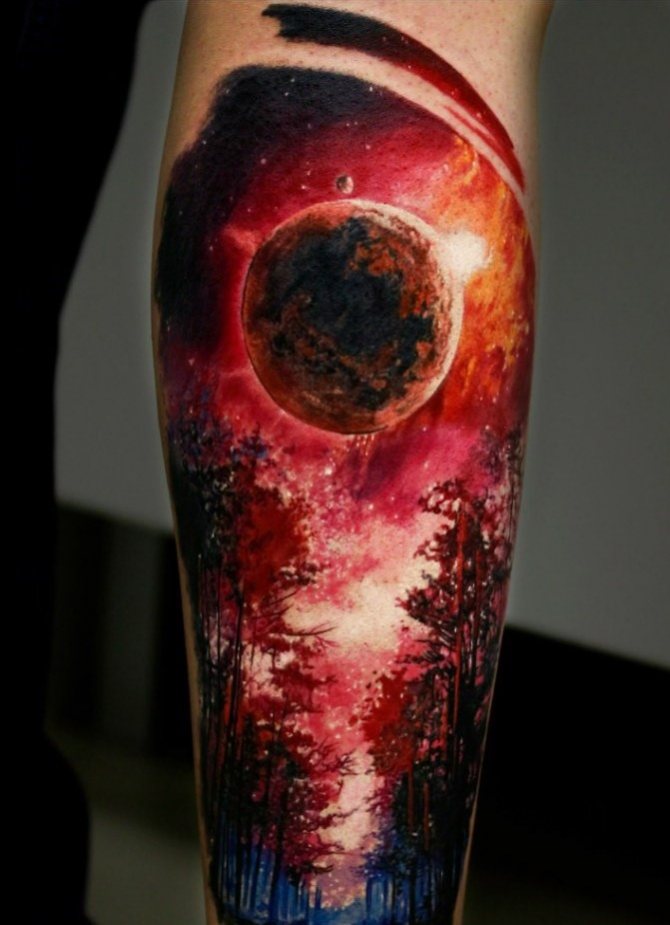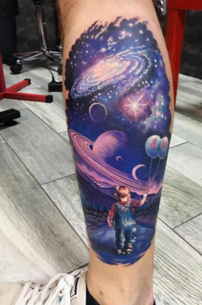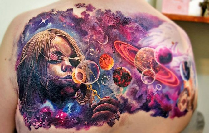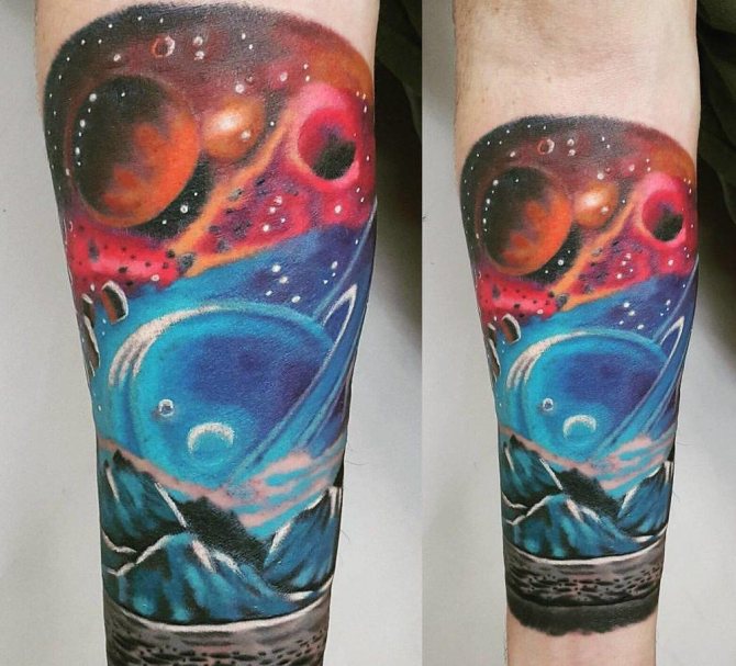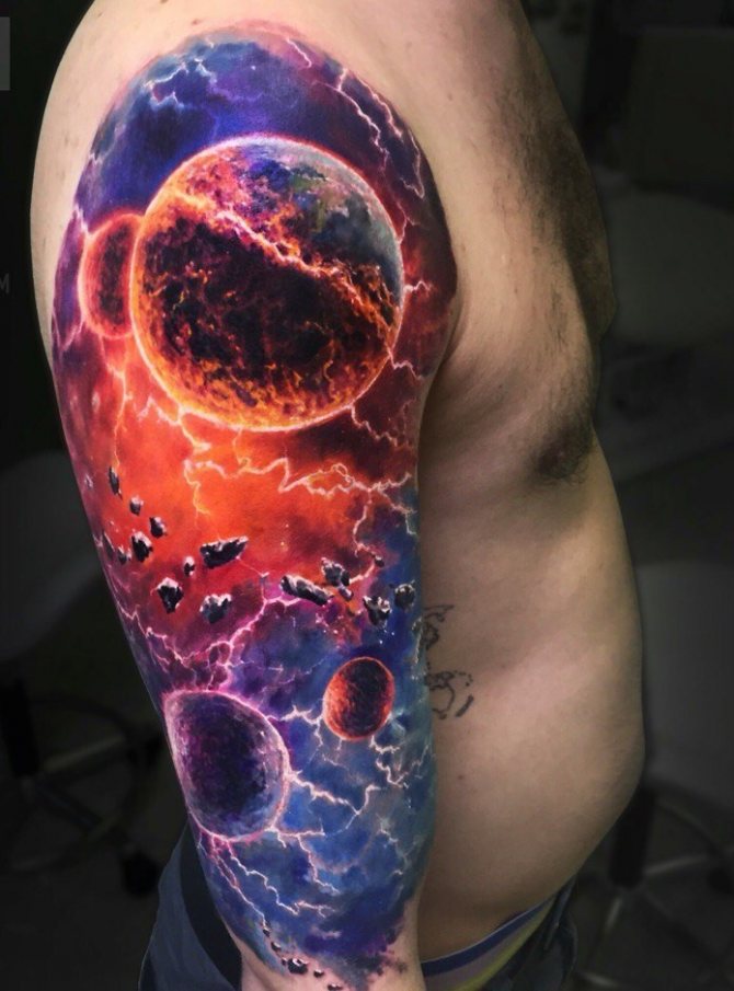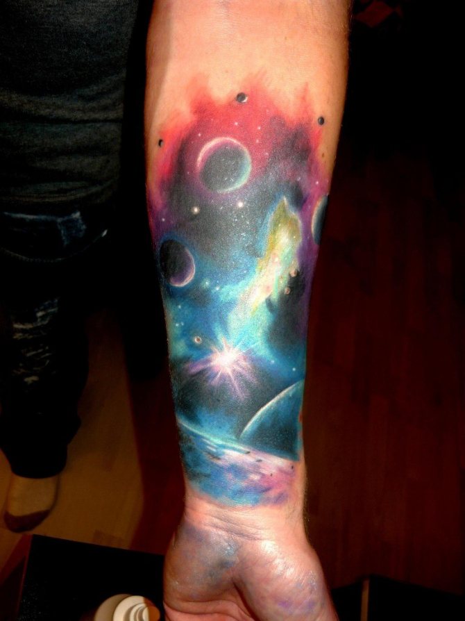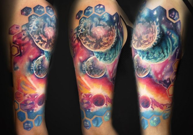 - A colored tattoo with planets is the most popular and attractive option. It is customary to dilute the colored background with dark spots (planets) and white highlights (stars).