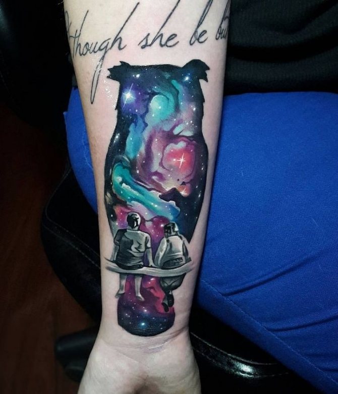 As for the style decision, the experts recommend giving preference to minimalism, thrash polka or black and white tradition. Very original looks tattoo space in the style of watercolor, when the drawing has a sloppy appearance, it may seem that it is created with watercolor paints, only instead of the canvas is used human skin.