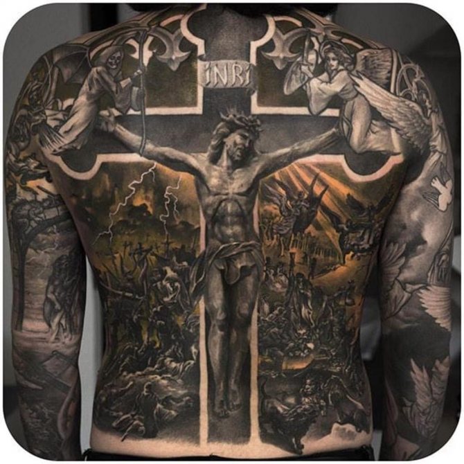 It is not worth commenting or discussing in any way this type of tattoo - you could seriously offend people. They themselves can tell about the meaning of the drawing and the reasons for its appearance. We are not necessarily faced with a religious fanatic, just a very serious and deeply religious person. It is unlikely that such things are stuffed just in the mood - it does not bring good luck in life.