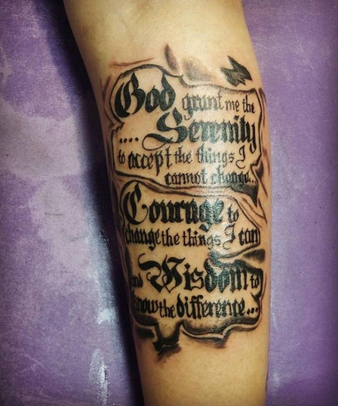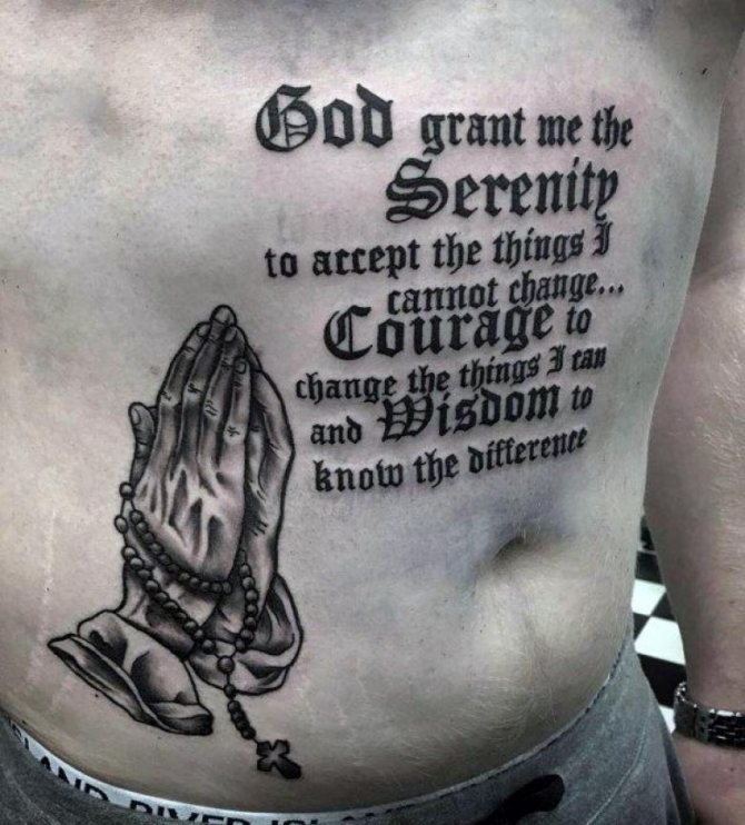 For the bearer of a tattoo a prayer is a way of uniting with God, sacred texts remind of the main thing and make you think about observing the rules of tradition and the given promises. Especially if the prayer tattoo is low-key and not flashy, as a rule, it is not exposed. This is a way of saying "thank you" to the Creator.