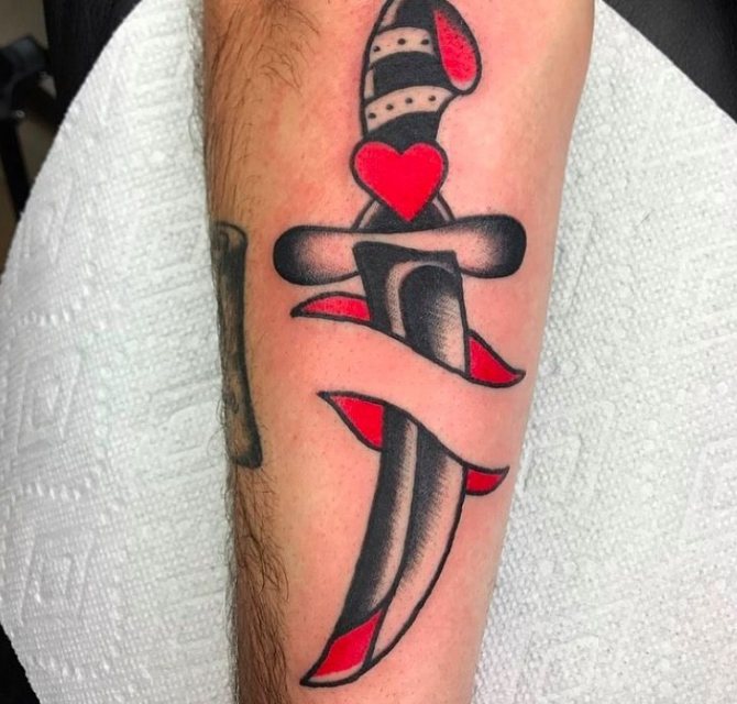 The most popular style is considered old-school. The sketch is made in dark saturated colors with the application of clear lines without smooth color transitions. Tattoo with the image of a knife is also chosen by celebrities.