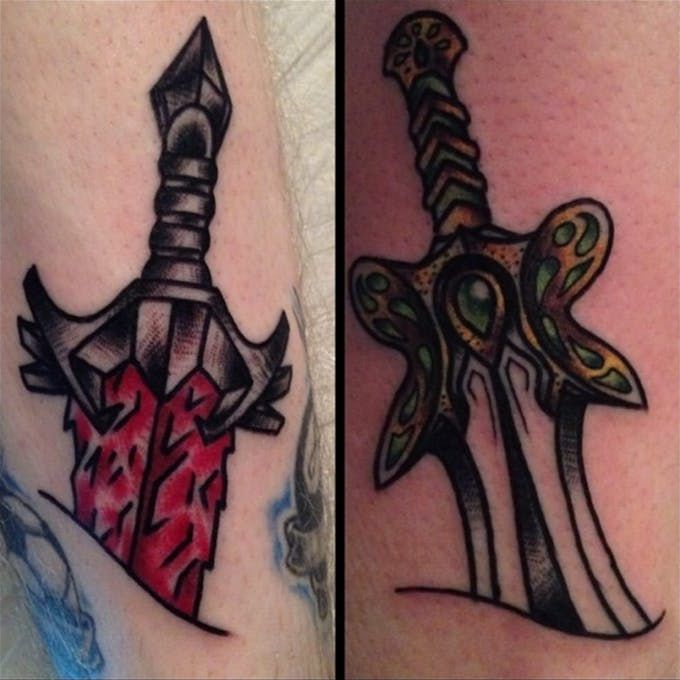 Judging by the large number of photos of the blade tattoo in the catalogs of sketches, on the sites of salons and pages of masters, many make a choice in favor of realistic works. Usually depict a blade that plunges into something: skin, heart or even an eyeball. You can meet the large-scale work (mainly on the forearms), simulating deep cuts with bloody streaks, in one of which stuck the blade. If such a tattoo makes the master, specializing in realism, the work looks bright, spectacular and scary, as, in fact, and should.