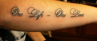 Just as no two people are alike, one does not often see identical body art. This case is strictly individual. Tattoo inscriptions on the arm for men are often more militant than for girls, who choose more feminine and sensual phrases.