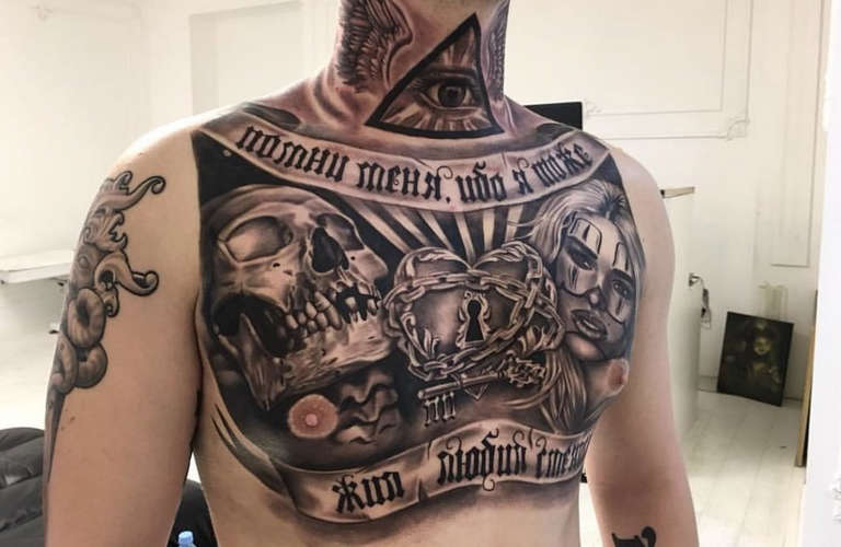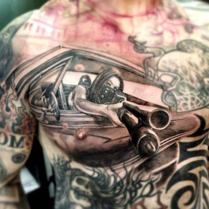 | Chest and back | Looks tattoos on the pumped up male chest. For the maximum disclosure of the inner world of the man the area of the body is extensive enough. For the same reasons tattoos are applied on the back. On women large images look disharmoniously. Usually, female representatives of the weaker sex are advised to use inscriptions on these zones. |