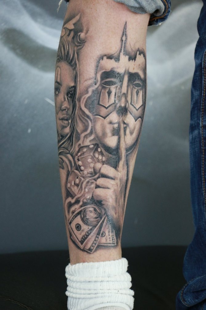 The original name of the style of tattoos "Chicano" comes from the name of the indigenous Indian tribes that lived in the United States in the XVI-XVII centuries. Over time, the members of this ethnos dissolved into the rest of the country's population. The manner of drawing was developed by the Latinos who were serving time in the United States. Popular subjects included the face of the Virgin Mary or Jesus Christ, biblical quotations, and excerpts from prayers. Attributes of the criminal world were also common, such as gold bars, knives, guns, etc.