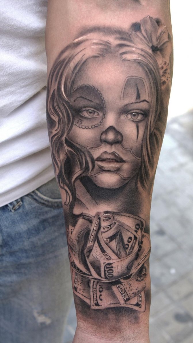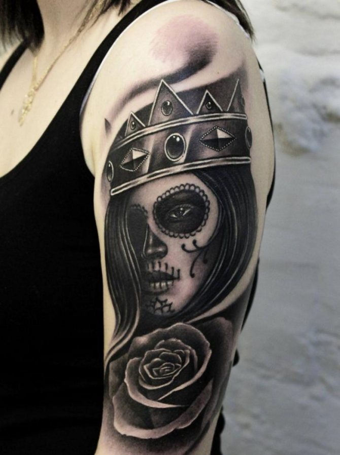 Chicano tattoos for men, made in the classic version, contain sketches of girls. The most popular to this day is the drawing of Santa Muerte, which translates from Mexican as "holy death. The basis is a detailed image of a girl's skull with stitched lips.