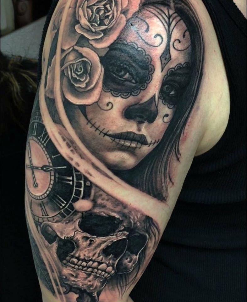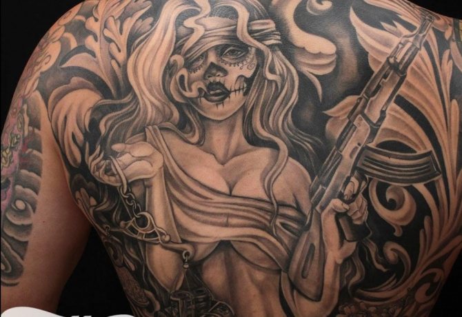 Chicano tattoos, made in the male style, carry a deep semantic load. The drawings symbolize the mortality of existence and justice. Often the sketches are associated with the popular "death dance" plot. The images are steeped in mystery and full of negative energy. This is largely due to the execution of drawings in black and gray. Bright touches are added to accentuate it.