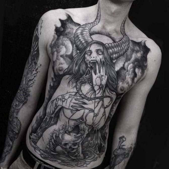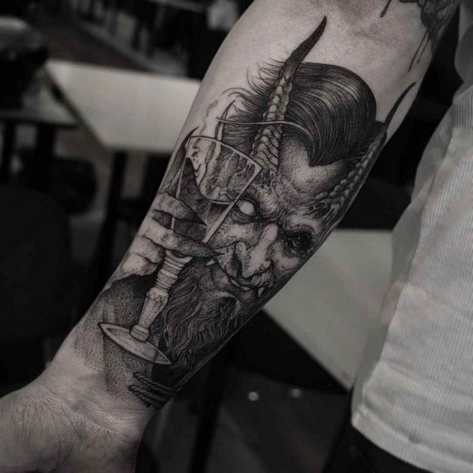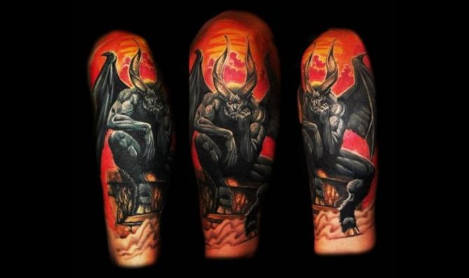 Satan tattoo can be depicted full-length or with only a face, which is represented by red skin, a distorted smile and horns. Consider other options with the disclosure of interpretation: