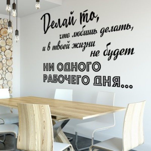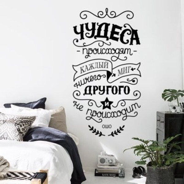 Achieving the desired goal can be achieved in different ways. More often than not, various décor comes to the rescue: art, textiles, tableware, fixtures. But more recently, uniqueness can also be emphasized with inscriptions; they solve the following problems in the interior: