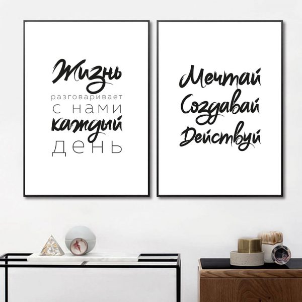 Decor of this type is easy to place on any part of the wall, and then as quickly remove or re-hang it if necessary. Another advantage of an inscription placed in a frame is the possibility to change an outdated or boring text for a new, inspiring one in a few minutes. To do this, simply take the sheet out of the frame and insert another one into it.