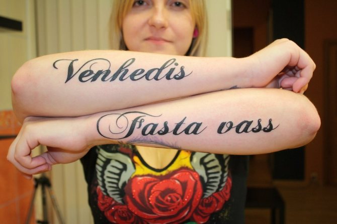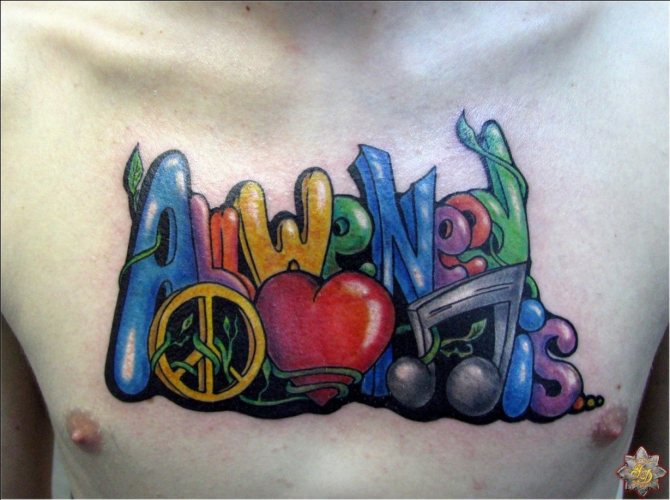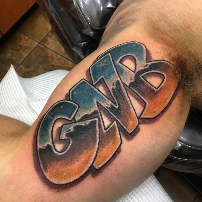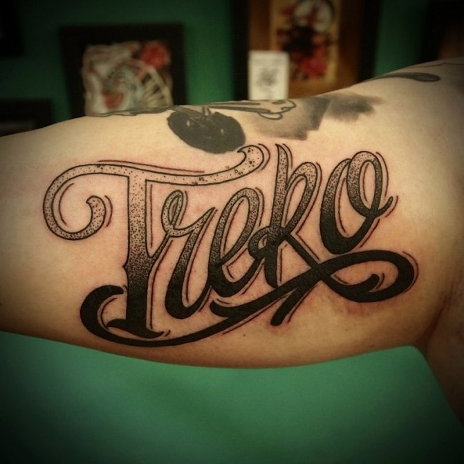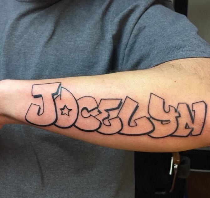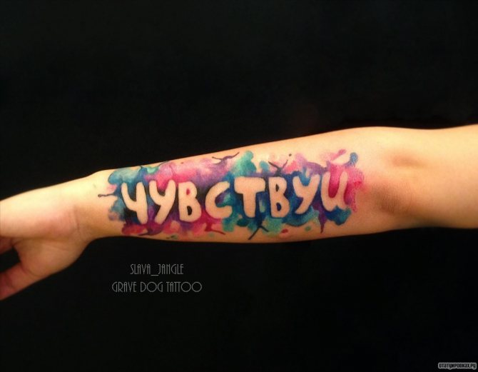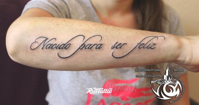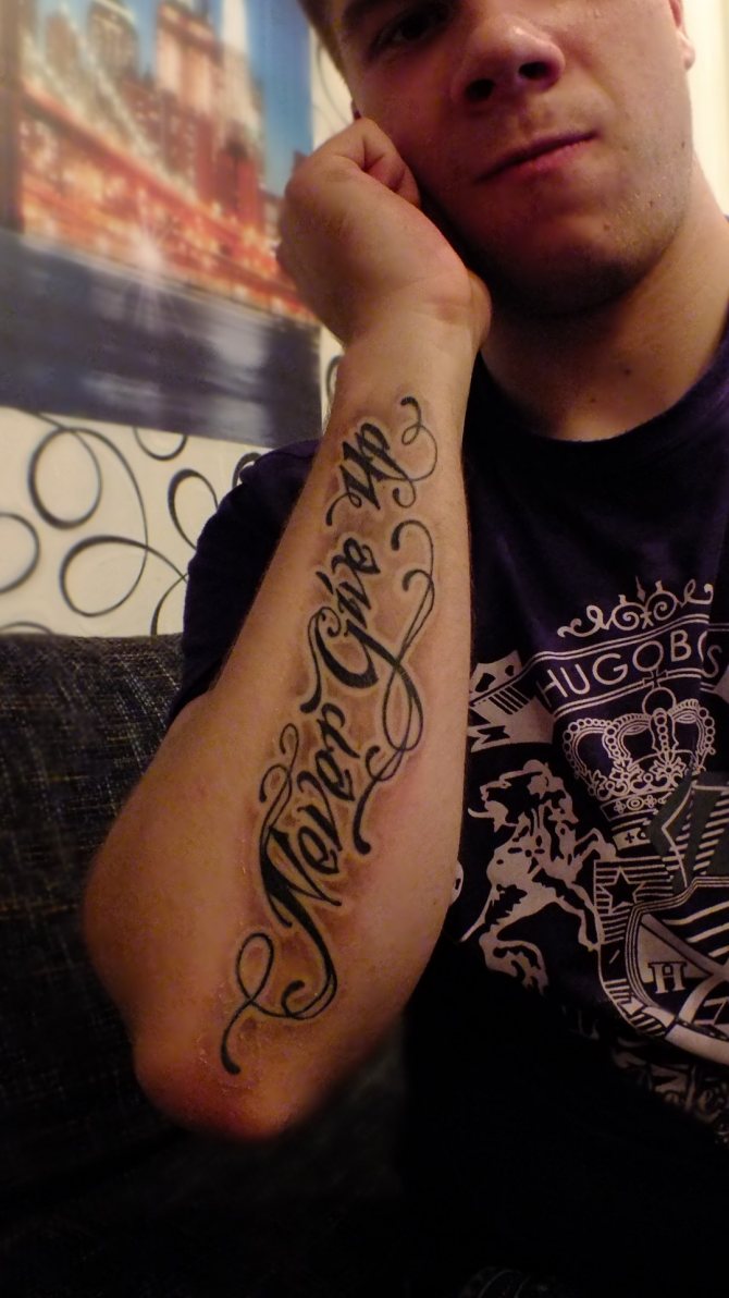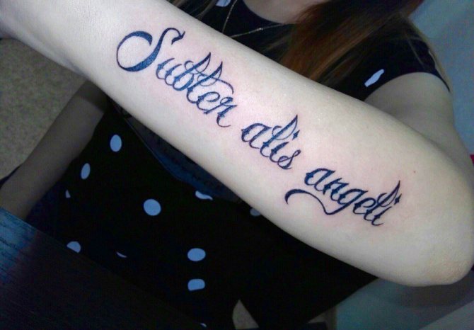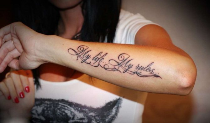 More often the tattoo inscription is placed on the arm, obviously this part of the body is constantly in view, and the letters, made in any style, catches the eye. However, this is a simple option for the location of the inscription.