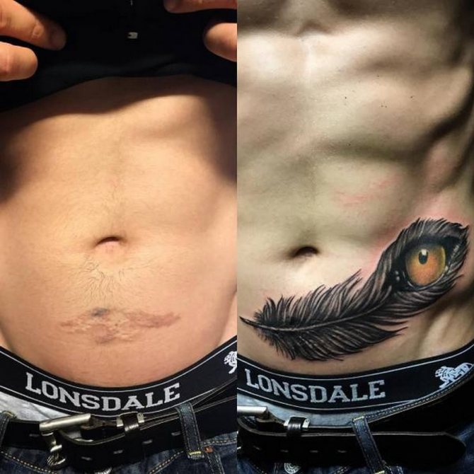 If the scar is of a convex shape, its color significantly differs from the skin, to save the situation will be able to tattoo "situational", when the picture is chosen so that the protrusion of the scar harmoniously fit into it, as shown in the photo below.