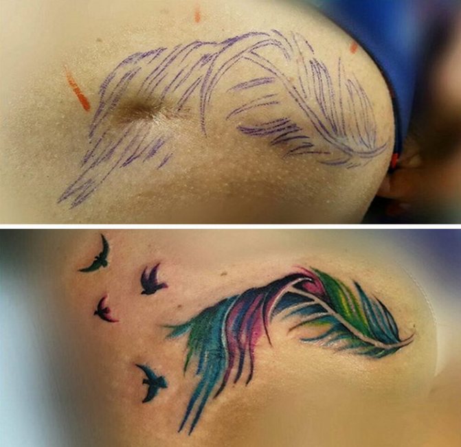 In tattoo salons, you can choose a drawing from a variety of options. It can be a feather, a lightning bolt, a beautiful flower, which girls love to choose, or an inscription. It is worth orienting on the shape of your scar, listening to the recommendations of the master.