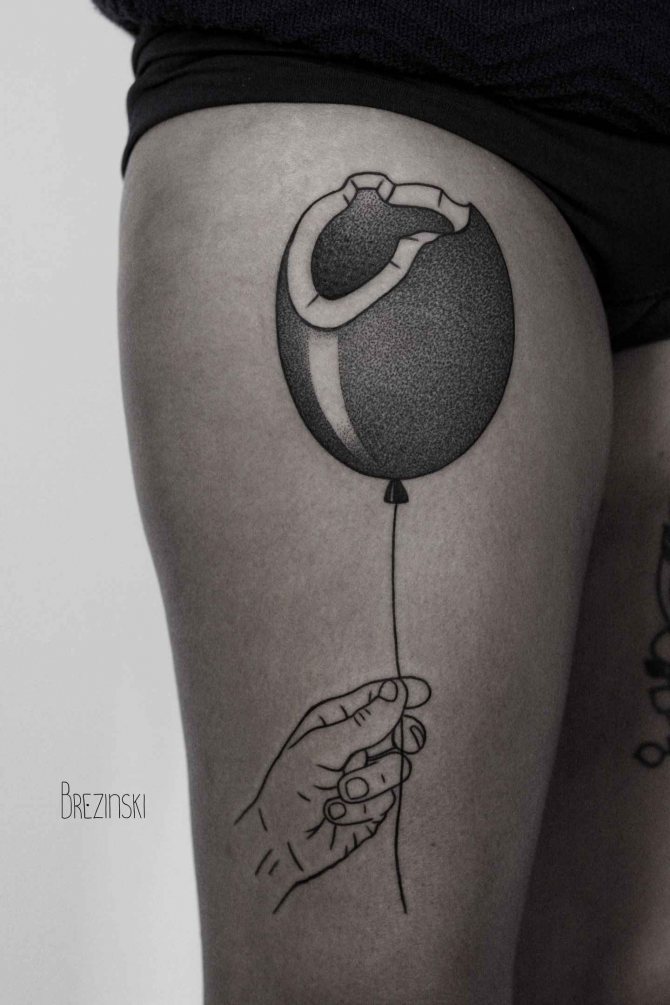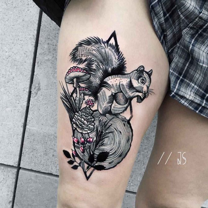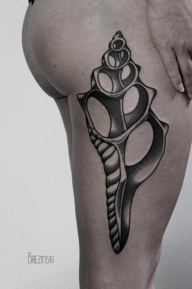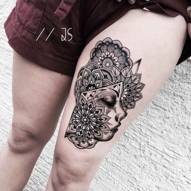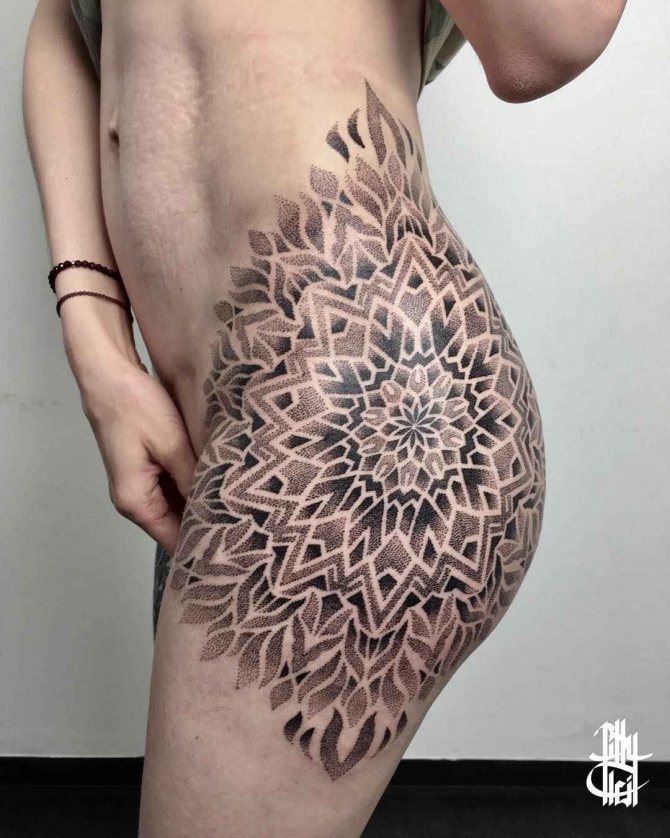 The technique of pointillism is great for performing large tattoos that have recently entered fashion on the thighs.