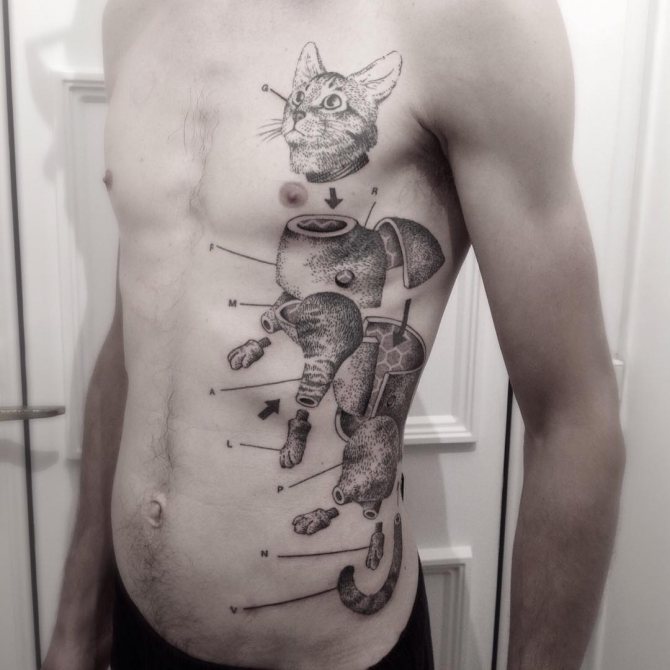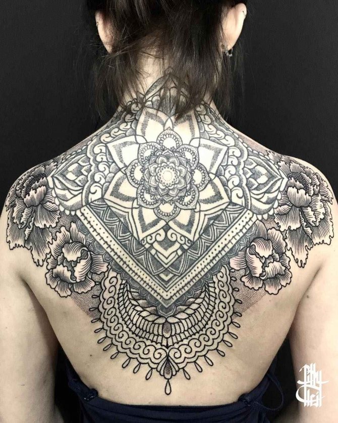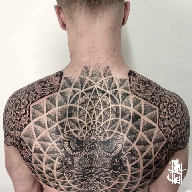 The most memorable ornamental works in the direction of Pointillism are large tattoos on the whole part of the body, such as "sleeves" or covering the back with a pattern. Such large-scale work is a great way to hide an unfortunate scar.