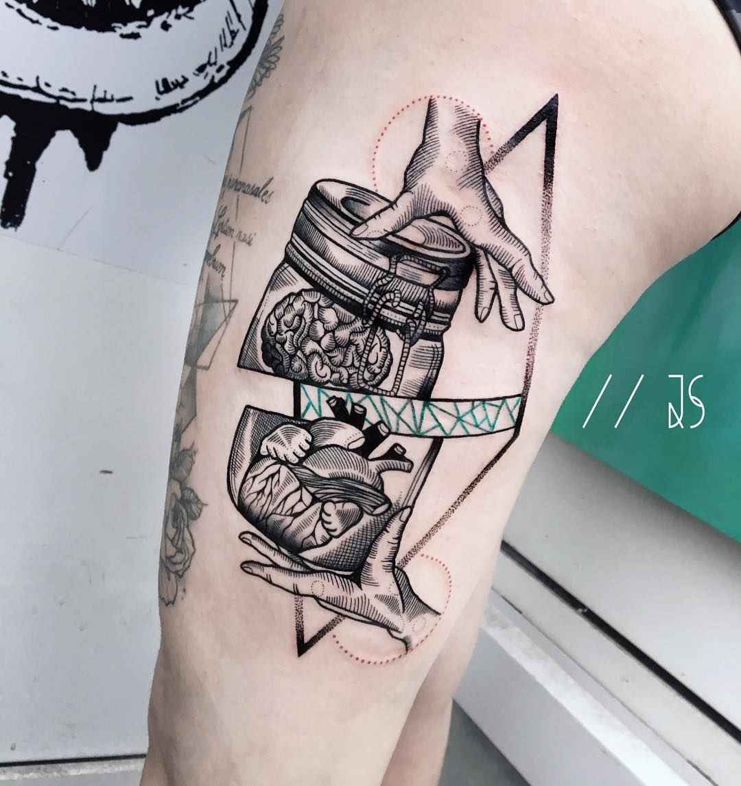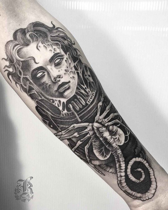The subject matter of the plots has no limits. Experienced craftsmen can implement in Dotwork absolutely any idea of the client. Combination with other styles, such as thrash polka or old school is possible.