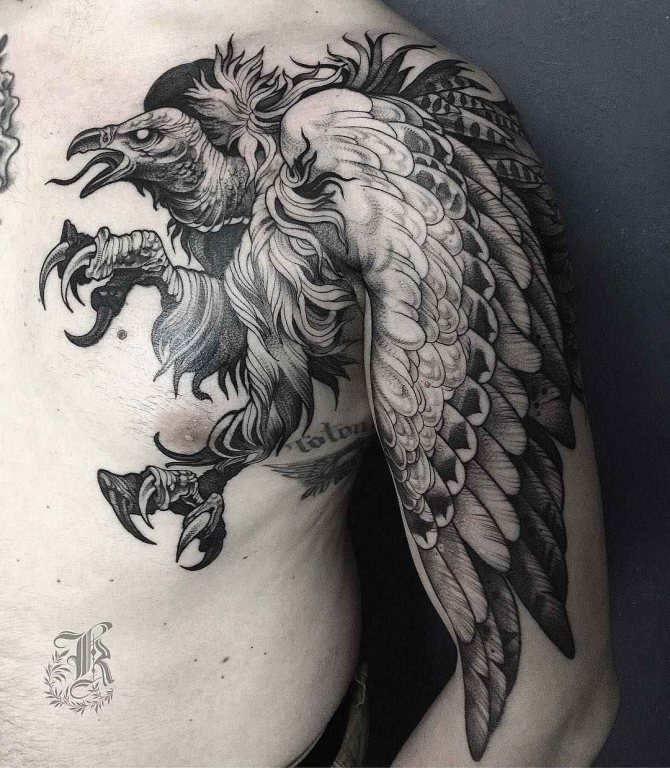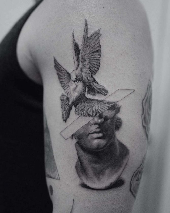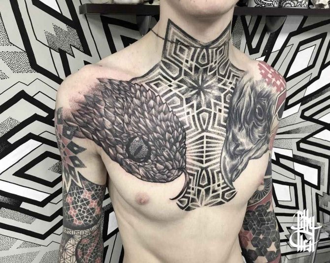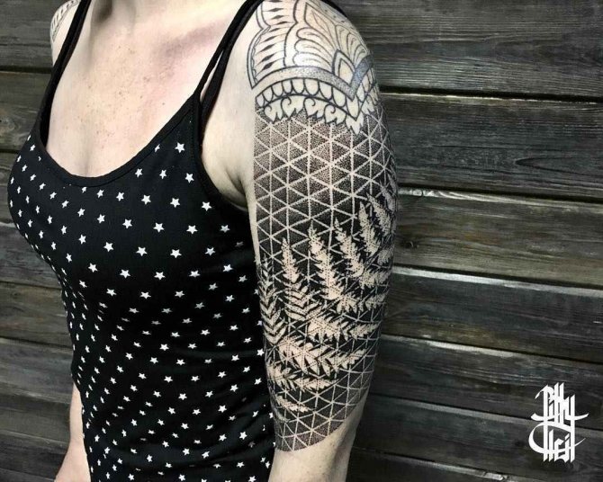 Dotwork style is created for men. Such a tattoo looks attractive and mesmerizing on a pumped up male body. Volumetric drawings and bright lines represent power, strength and stability. But the elements of the body drawing should complement and combine with each other. Each detail of the tattoo fits into the main ornament, and at the same time creates an overall symmetry. If we take a closer look at the Dotwork tattoo, we can highlight the large presence of geometric shapes and floristics.