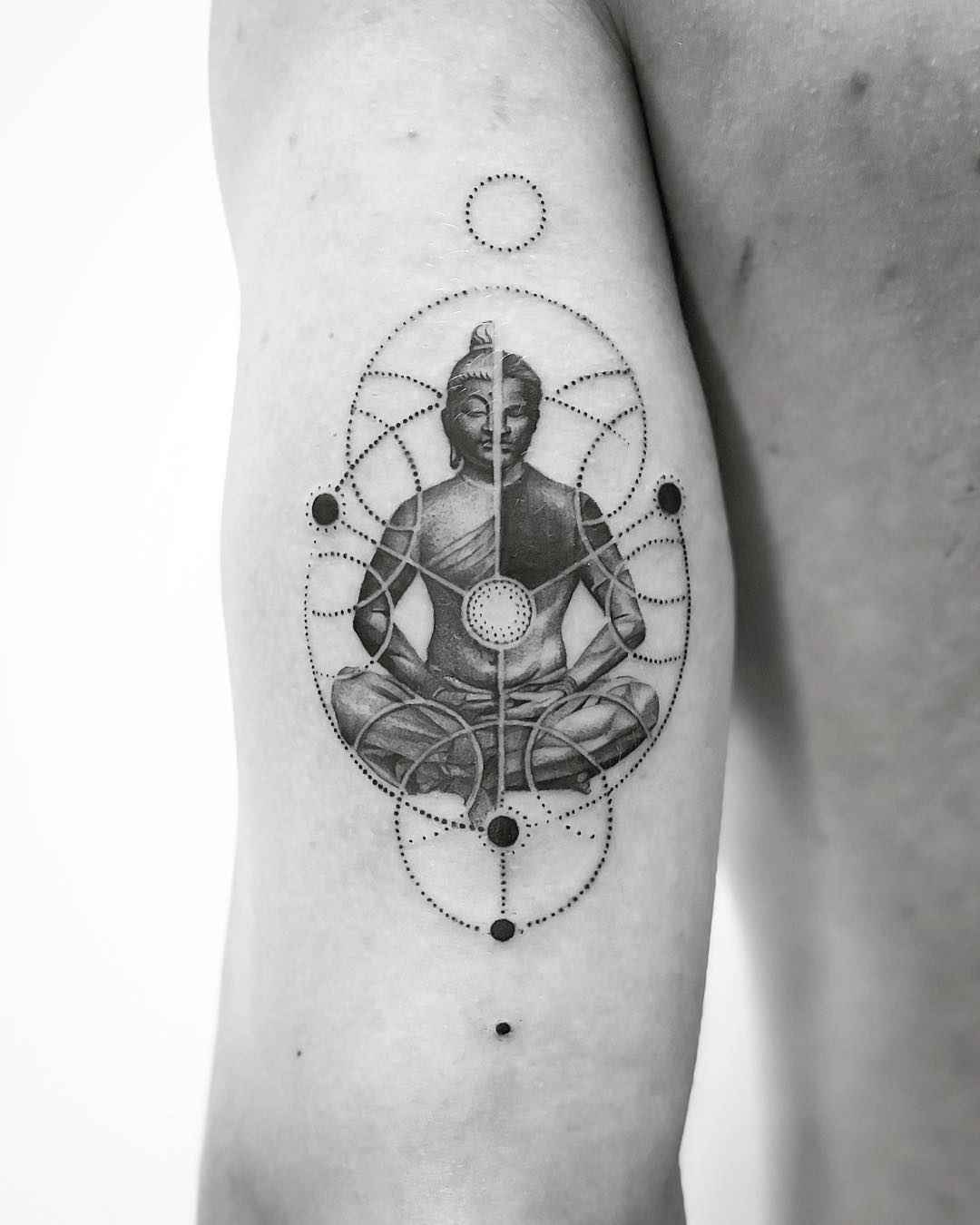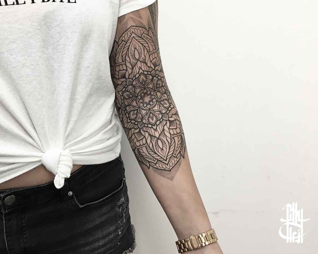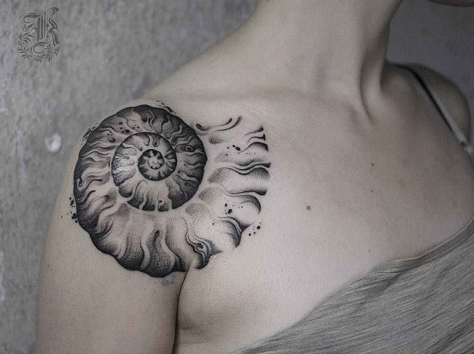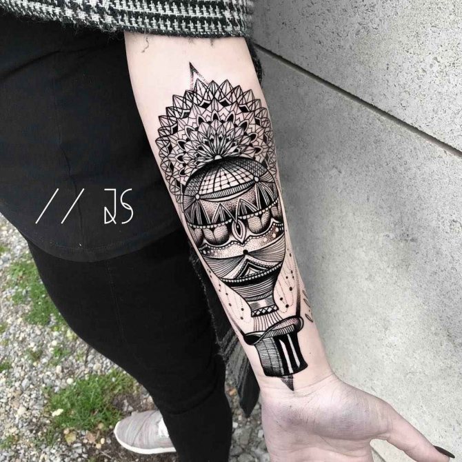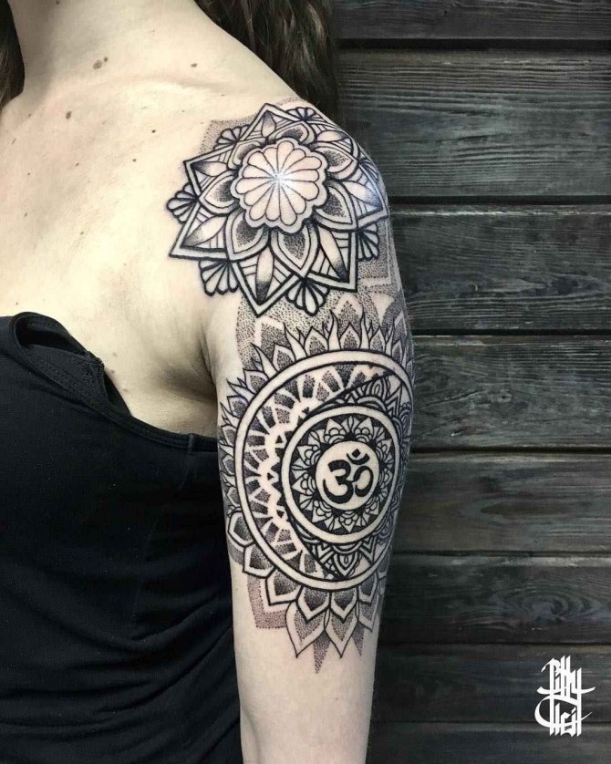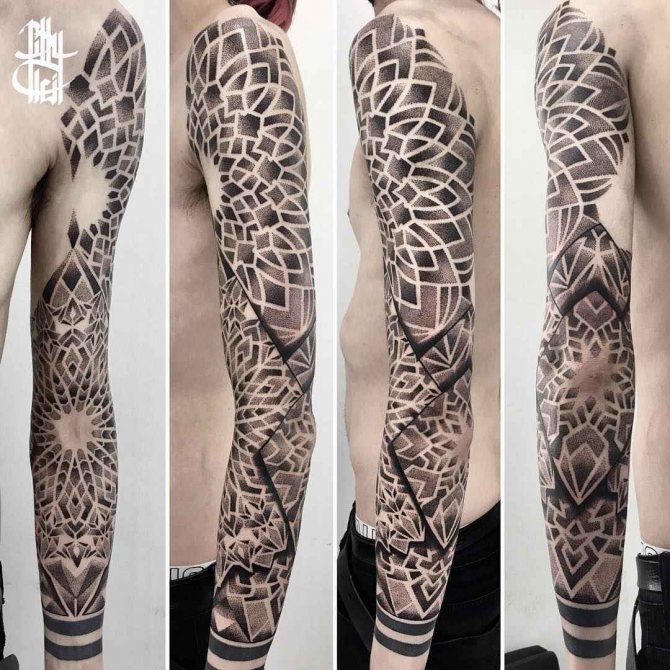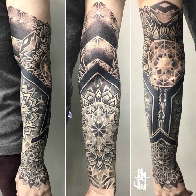 The Dotwork tattoo is applied with multiple dots. The size and number of dots depends on the chosen style and subject matter of the design. Dotwork style is based on the African technique of scarring in the form of dots and filling them with lava ash. The style of such tattoos is a set of symmetrical figures, made with varying degrees of depth of color application. Dotwork features require large drawings that occupy a large area. Small dotwork drawings look inconspicuous and lose their beauty and appeal. If you have chosen for a Dotwork style tattoo, be sure to consider a large-scale design, such as the basis for a "sleeve". The meaning of such tattoos is mainly directed to the forces of nature that fill a person's life.