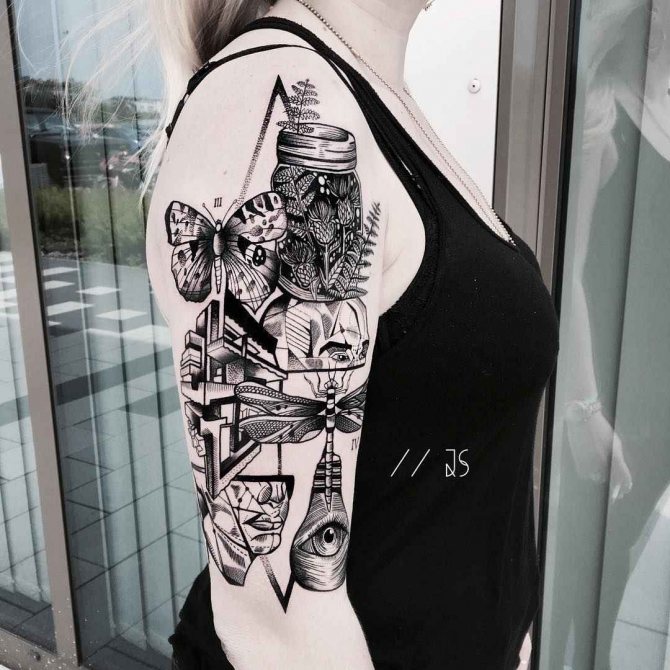 The versatility of the technique allows you to perform non-standard abstract compositions. Based on the idea, almost any image can be included in the tattoo. The application of paint at different distances from each other makes it possible to give lightness and airiness to the image.