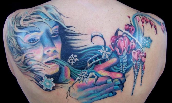 Colored drawings are very attractive and quite noticeable, so if you want to demonstrate your tattoo to others, you need to perform colorful options. When performing such an image, you can safely use blue, red, orange or green colors. It is not necessary to perform the entire drawing in color, you can leave the basis in a classic black format. It is enough just to make an accent in the form of a blue wave or water, and the tattoo will immediately get a more attractive look.