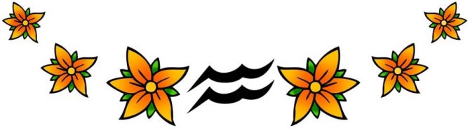Floral designs as an addition are most often chosen by gentle and romantic girls. Floral drawings can be made in large size as the background of the tattoo. Sometimes small flowers are depicted instead of water pouring from a pitcher. Flowers can also decorate the very sign of the constellation Aquarius, which is made in the Roman style. For men, it is typical to choose tattoos with a female image and a pitcher, with a floral design that can be placed next to the sign. Sketches on the floral theme with the sign of Aquarius - plenty.