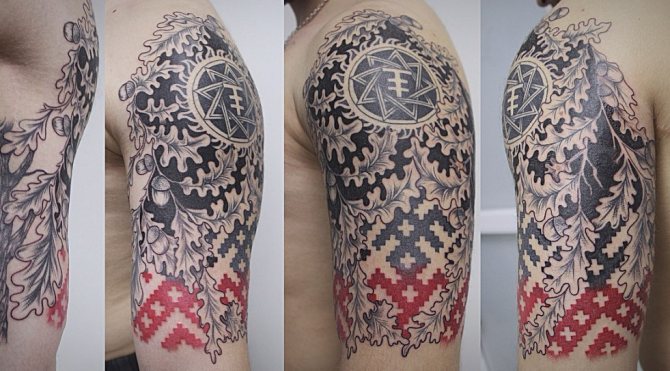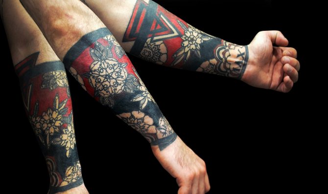 Men's ornaments are an inverted triangle, as well as an angle turned upwards, symbolizing strength and the heavenly roof (patronage and protection from the heavens). No less attractive and masculine option - a tattoo ornament with the image of a bull. When choosing a sketch it is necessary to choose a color scheme. Since ancient times, it is believed that the masculine colors for tattoo ornament are blue, green and black.