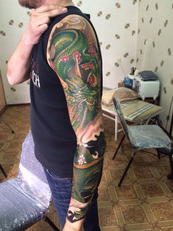 Lesha was waiting for Ivan for several months and the wait was worth it. Ivan did practically impossible! In "Tattoo Pharos Studio" for 23 hours, he once again proved that he is worthy of the title "Tattoo Master"! From shoulder to wrist, the left arm of Alexei, paints the incredible beauty of the Japanese dragon. An indestructible classic, the execution - the highest score!