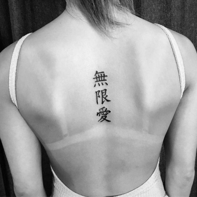 Decorate the body with a natal drawing with a hieroglyph a girl can on any part of the body. However, the most common place for a tattoo is the back and arms. In addition, this tattoo can be placed both vertically and horizontally - depending on personal preference. Of course, the most common are the vertical inscriptions of hieroglyphs on the back, which look mysterious and attractive, especially in the curves.