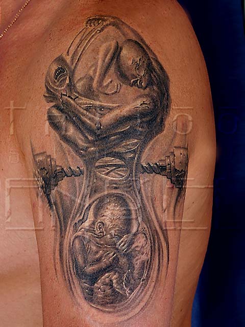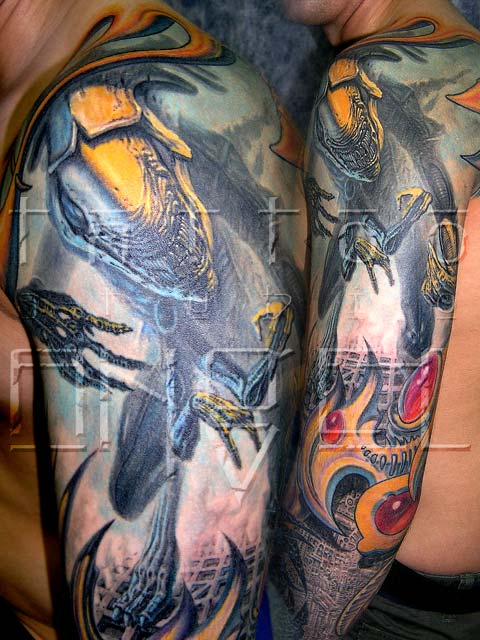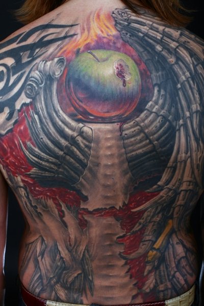This is as technogenic a tattoo as possible. In addition to being a design engineer, I'm also a horoscope Scorpio. Therefore, my back depicts a biomechanical robotic scorpion, which forcibly tattoos all of its victims - instead of the usual sting, it has a giant tattoo machine.