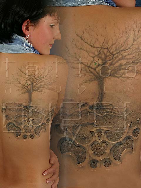 On my back is one of Giger's famous paintings, familiar to everyone from the development of the appearance of Alien, as well as the development of the style of biomechanics. Specifically on my back is a picture of Lilith, which is a kind of female demon. According to legend, Lilith was Adam's first woman, and she did not accept Adam, which she reported to God's lambs. But God commanded her to be with him anyway, to which she told him she would rather go to the dark side than stay with this man. So she fled, but God's servants caught up with her near the Red Sea. Then she threw herself into the Red Sea and became Lucifer's concubine.