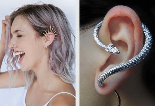 Cuffs - These are big pieces of complicated jewelry, which are fixed in the upper part of the earflap and do not require piercing. It's all about the right weight distribution of the accessory.