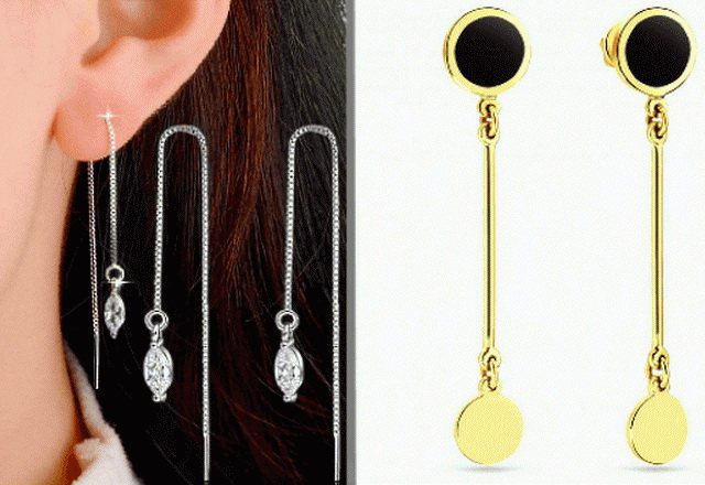 Prongs - The earrings are made of thin chains with smooth oblong pins. Such earrings do not have clasps and are held in the ear thanks to their though small, but weight. Some earrings look like studs, but with a chain dangling behind the lobe, while others dangle both in front and behind the lobe.