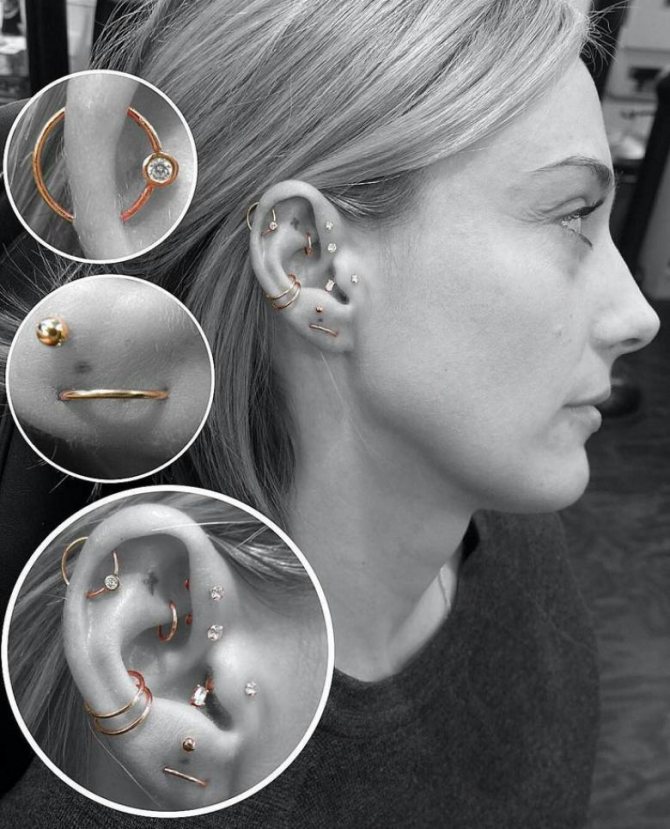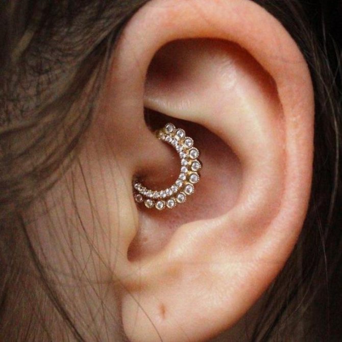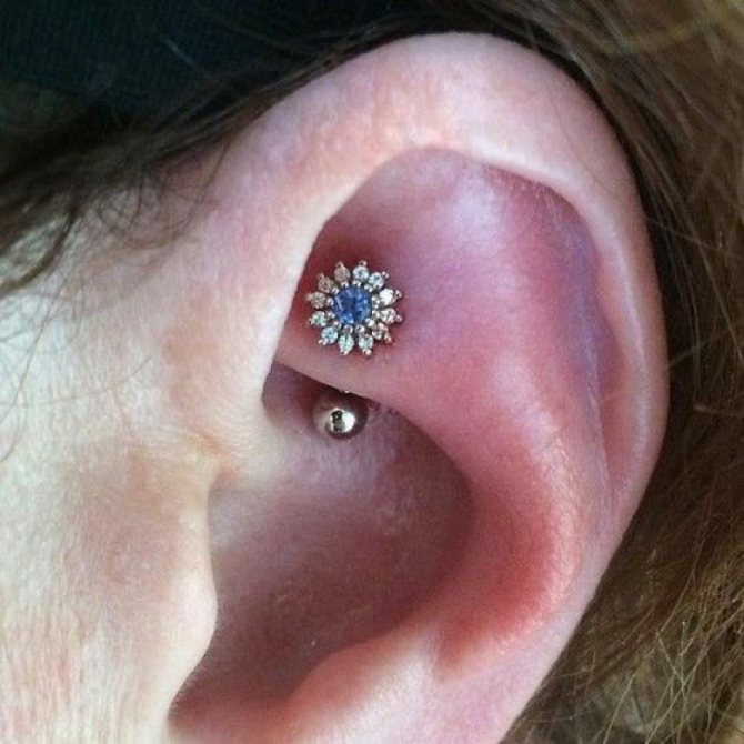 - Deis piercing is supposed to be a piercing in one of the curls of the inner cartilage, performed from top to bottom. Half rings, rings, rods of a certain type can be placed. Sometimes several piercings are made. This type is universally suitable for both sexes.
