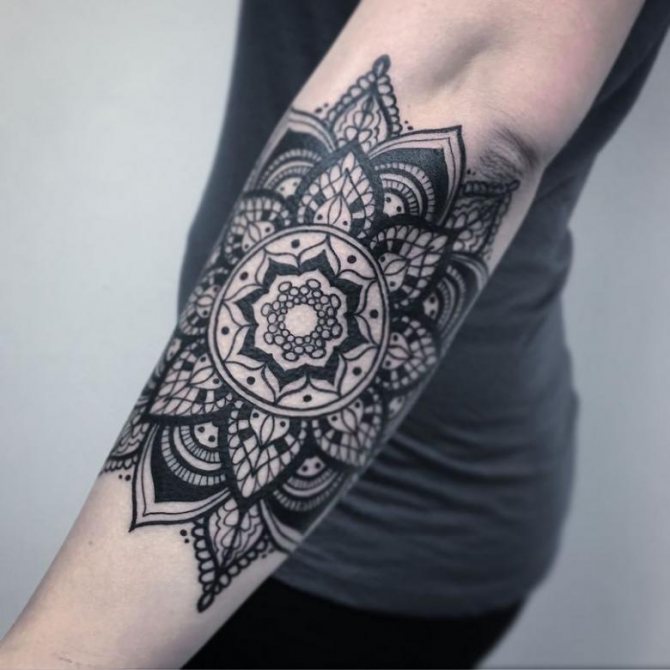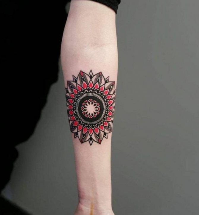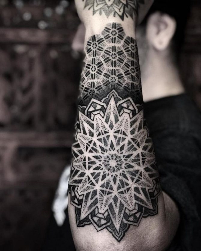 - Tattoo sleevecovering the forearm, makes it possible to place complex multi-component amulets. It looks such a tattoo is very effective. Can be placed on the arm and a small elegant tattoo. According to the Buddhist beliefs, the mandala on the hand takes signals from the Cosmos, as well as protects the bearer of the tattoo from rash actions.