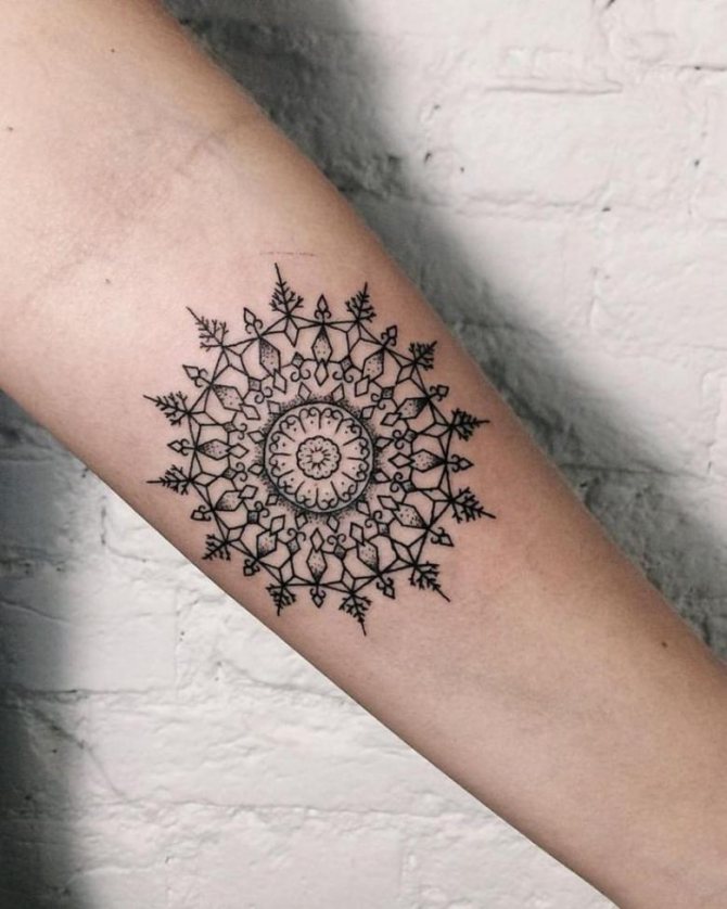The paired mandala tattoo can be applied to the forearm and wrist - For mandala tattoos, the paired application effect is often used. Symmetrical drawing vertically divided strictly in half and applied halves on the hands, ankles, feet. A miniature mandala can even be divided into two fingers.