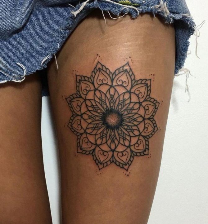 - Thigh allows you to apply a complex mandala with a large number of elements, its shape is optimal for a round drawing. But also a small geometric mandala will be appropriate here.