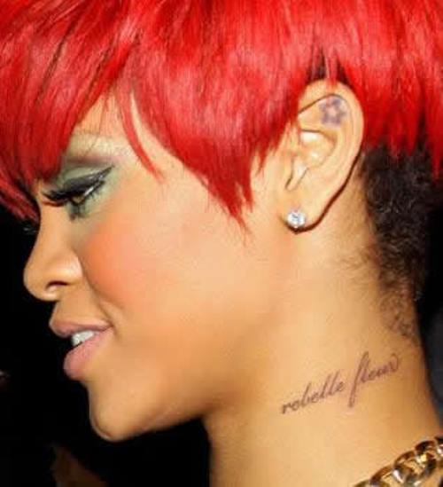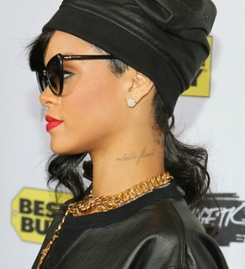 Rihanna tattoo French phrase on the neck