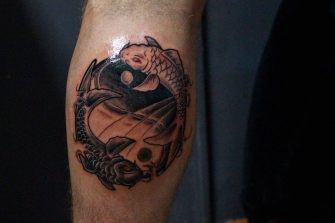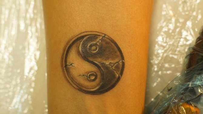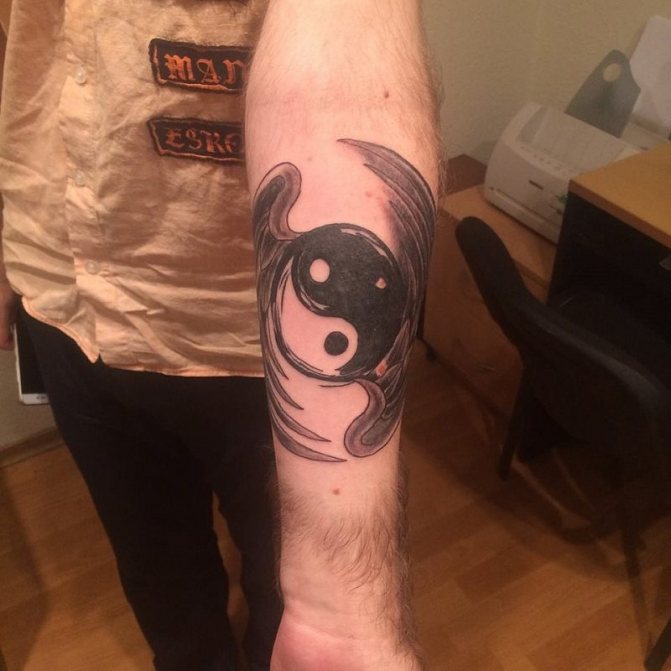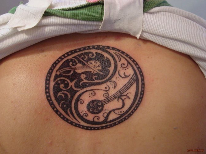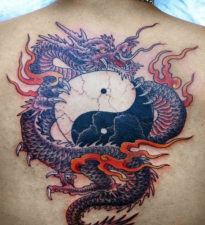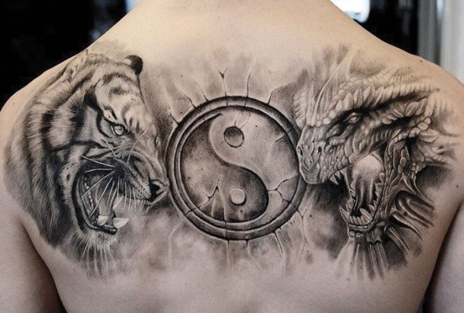 Sometimes the sketch of the tattoo may not contain the usual image of Yin-Yang, but to convey the meaning of this sign indirectly. Instead of the usual black and white half with dots there can be two opposites - for example, fire and water or earth and air. In Chinese culture, such antipodes are the tiger and the dragon. Individually they are completely opposite, but together they form a whole and symbolize the balance of power.