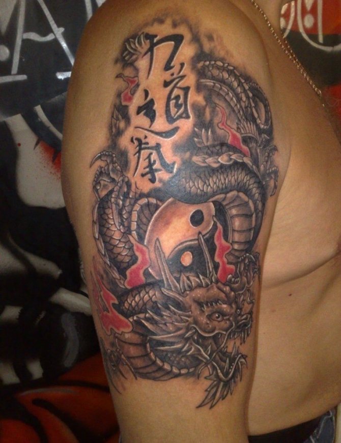 - Yin-Yang tattoo with a dragon. Placed around a symbol of Yin and Yang, dragons symbolize tenacity, willpower and courage. A tattoo with a dragon around the Yin-Yang can be seen on the arm of actor Alexander Petrov, known for his role as Grisha Izmailov in the TV series "Policeman from Rublevki". He has a temporary tattoo and is part of the character's image.