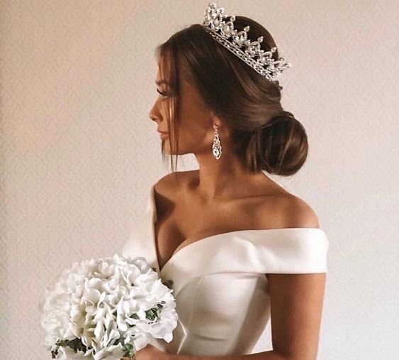 El peinado de boda más popular con una corona es un moño. Puede ser alto, medio o recogido en la parte inferior, casi en el cuello. Para conseguir un peinado con volumen, utiliza un rulo o un rodillo y retuércelo previamente, ya que los rizos pueden crear un volumen extra.