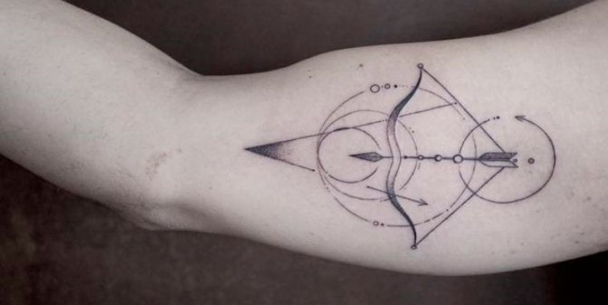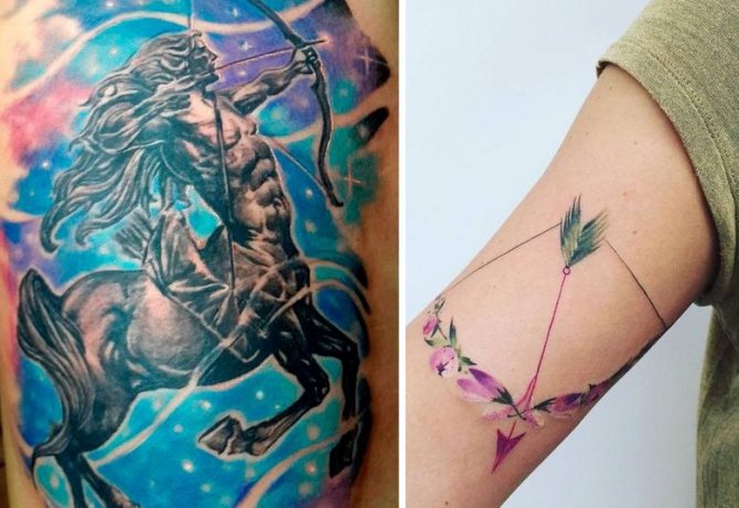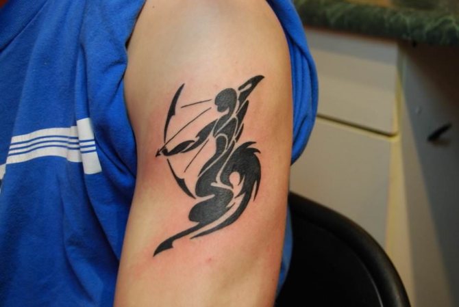 El símbolo de Sagitario parece una flecha que apunta hacia arriba. Estos tatuajes son la elección de los tipos creativos. La gente de todo el mundo debería ser consciente al instante de que el portador de esa marca en el cuerpo es una persona versátil, desarrollada en todos los aspectos. Los sagitarianos tienden a mostrar fortaleza de ánimo en todos sus esfuerzos.
