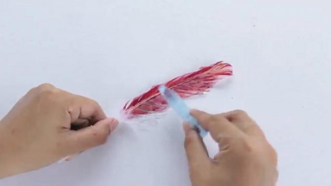 Muévete desde la base hasta la punta, tocando apenas la superficie de la pluma con el pincel pintado y sin intentar penetrar más profundamente. Debe pintar estrictamente en la dirección del crecimiento del mechón para garantizar una capa de color uniforme y hermosa y para evitar que se dañe la estructura de la pluma.