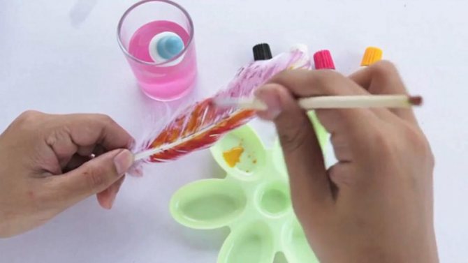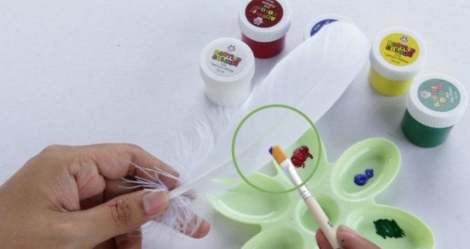 Coge un pincel de grosor medio y sumérgelo en la pintura que formará la base de la pluma de color. Utilice sólo un poco, de lo contrario las plumas se pegarán. Si el color se queda corto, siempre tienes tiempo de añadirlo.