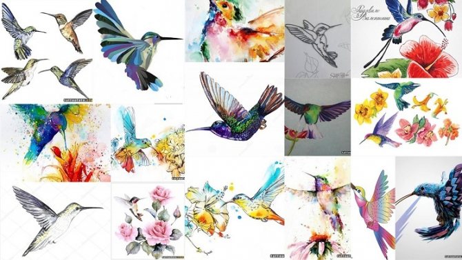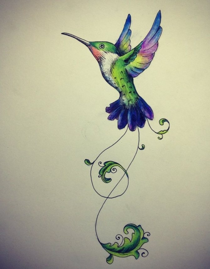 Las fotos del tatuaje del colibrí en el cuello muestran que cualquier combinación de colores estará justificada. Es posible crear un dibujo de fantasía único, cuyas tonalidades están limitadas sólo por las preferencias de color del propietario y del maestro del tatuaje. No menos original y fresca mirada opciones figura en forma de contorno, hecho con líneas de contorno, o un patrón completo con múltiples colores.