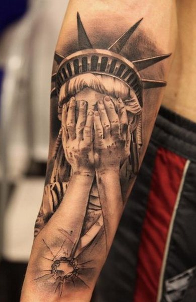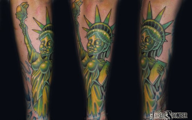 El tatuaje de la Estatua de la Libertad, más a menudo nabiruyutsya jóvenes que creen en los ideales de justicia e igualdad, leales patriotas de su país - los Estados Unidos. La tendencia de los últimos años es que cada vez menos estadounidenses se tatúan el símbolo, dejando esa prerrogativa a los residentes de otros países. En cada país, este símbolo puede adoptar significados diferentes, a veces incluso muy alejados del original. Pero esta imagen clásica siempre se representa como una silueta femenina con un libro en una mano y una antorcha en la otra. Los demás elementos sólo están limitados por la imaginación del artesano y de la persona que desea pintar esta imagen en su cuerpo.