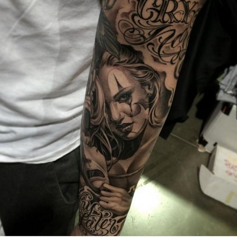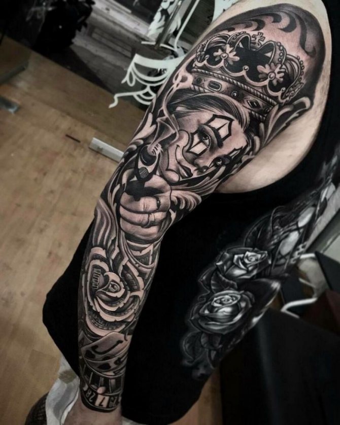 Un diseño muy popular hoy en día es la versión de manga del tatuaje chikano. Una imagen gruesa y saturada cubre toda la superficie del brazo desde el hombro hasta la muñeca. Tiene un aspecto muy bonito y convincente, como se puede ver en las numerosas fotos.