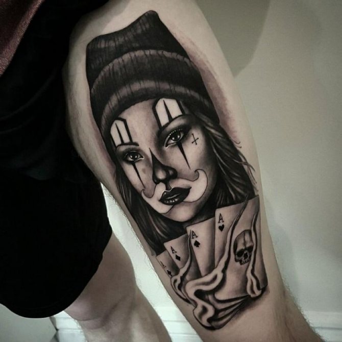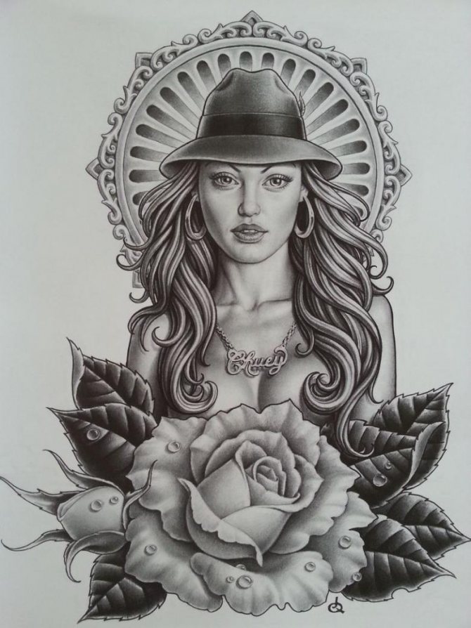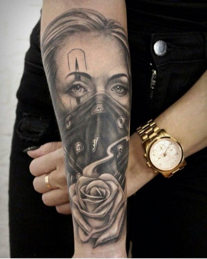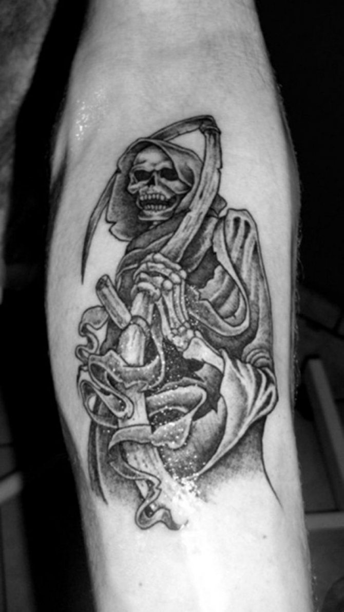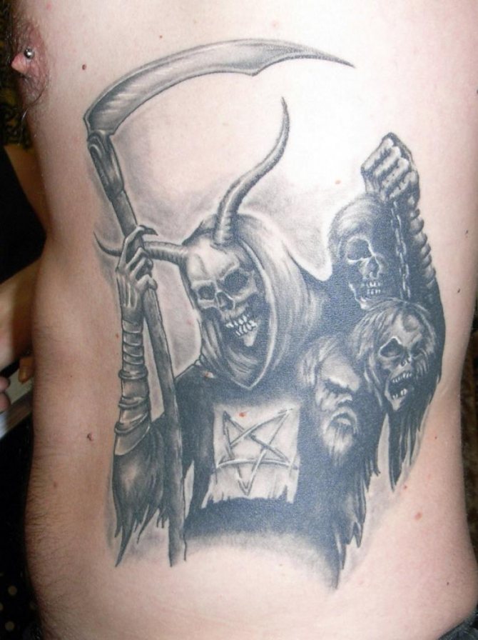 Las chicas solían elegir esta imagen macabra para subrayar su cinismo e indiferencia hacia la muerte. Por lo general, son personajes bastante atrevidos que no tienen miedo de hacer un encuentro temeroso con el personaje principal en el tatuaje. El símbolo muestra su carácter fuerte e intrépido.
