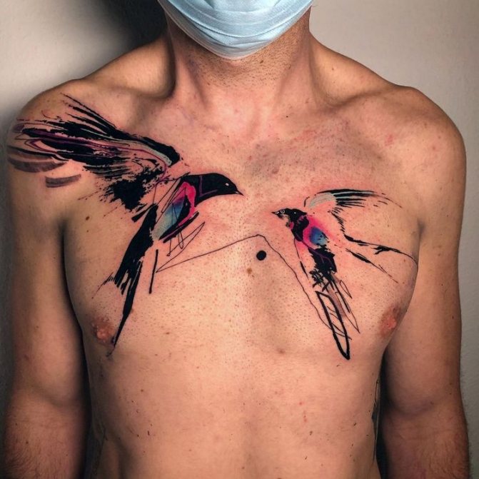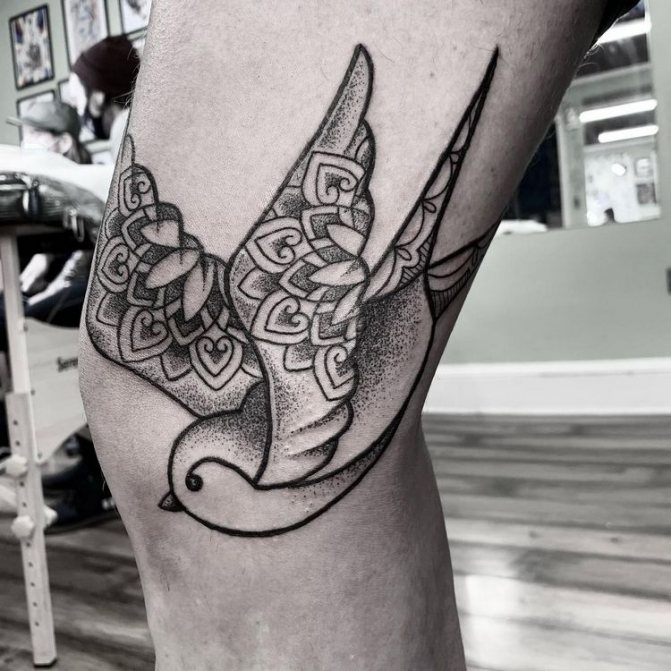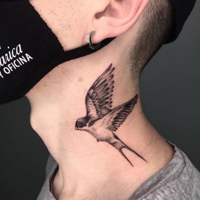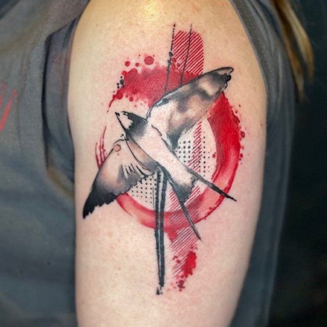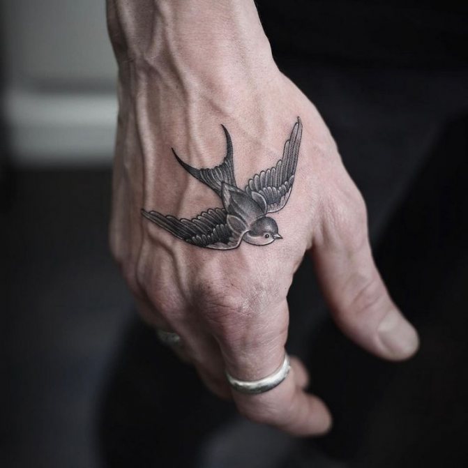 Tatuarse un pájaro golondrina significa juventud, prosperidad y buena suerte. También para las mujeres una golondrina simboliza la maternidad, la continuación de una familia, el cuidado de la posteridad. Tatuajes similares se colocan en la clavícula o el omóplato de los jóvenes.