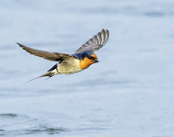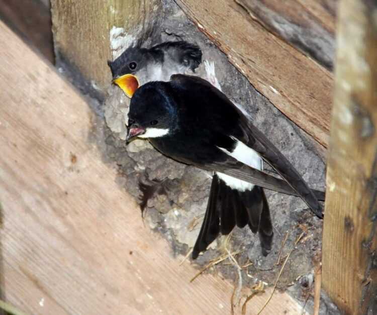 Golondrinas de mar - suelen anidar bajo los tejados. Se alimentan de insectos. Hay casos en los que las golondrinas de pueblo perecen cuando llega el frío repentino y no han tenido tiempo de volar para pasar el invierno. Su color es negro con un tinte azul, la parte inferior del cuerpo es blanca con un tinte rosado.