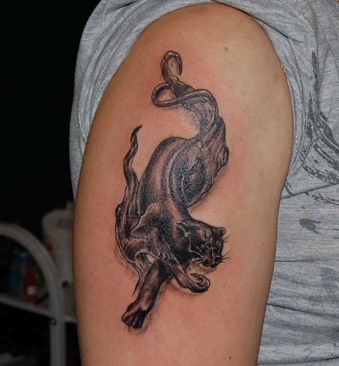 Los dibujos con una pantera son más atractivos para la mitad femenina de la humanidad, pero eso no significa que un chico no pueda hacerse un tatuaje de un carnívoro. En la versión masculina de tal imagen significa coraje, valentía, el deseo de no dar a sí mismo ya su familia en el camino del daño, la voluntad. En la versión masculina del tatuaje de la pantera también puede significar independencia, en la mente a la vez viene la frase sobre un gato que camina por sí mismo. Un tipo que rellena la imagen en su cuerpo en forma de un gato de los trópicos en la vida puede ser muy libre de espíritu y no querer algo o alguien para atar.